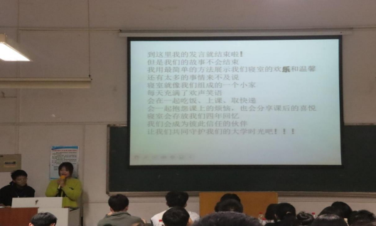 活动开始,参赛选手以讲述为主,辅之以PPT和视频的形式展示了不同宿舍的独特风采。选手们风趣幽默的讲解,看似分享的是他们宿舍室的日常生活,实则展现出同学之间团结友爱、努力进取的一面。